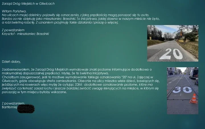 Urząd miasta zapowiada, że podobne prace będą prowadzone sukcesywnie w następnych częściach Gliwic. Służby miejskie będą pojawiać się w kolejnych dzielnicach, nanosząc oznaczenia przygotowane specjalnie dla stref zamieszkania i obszarów oznaczonych jako tempo 30. W komunikacie podziękowano także za nadesłane sygnały i opinie mieszkańców — to one miały wpłynąć na zakres działań w terenie.