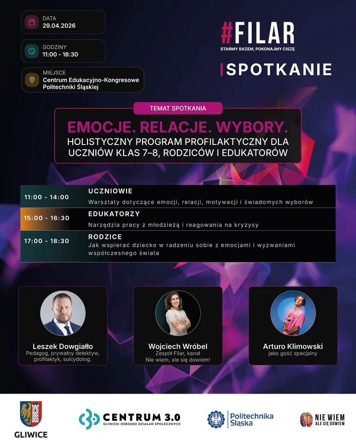 Za organizacją stoją Centrum 3.0 – Gliwicki Ośrodek Działań Społecznych, Fundacja FILAR, PROGRESOWNIA – Centrum Edukacji i Rozwoju oraz Politechnika Śląska. Właśnie to połączenie instytucji społecznych, edukacyjnych i akademickich daje temu wydarzeniu mocniejsze oparcie niż zwykłej jednorazowej prelekcji. Tu chodzi o próbę zbudowania wspólnego języka wokół spraw, które dla wielu rodzin są dziś najtrudniejsze.